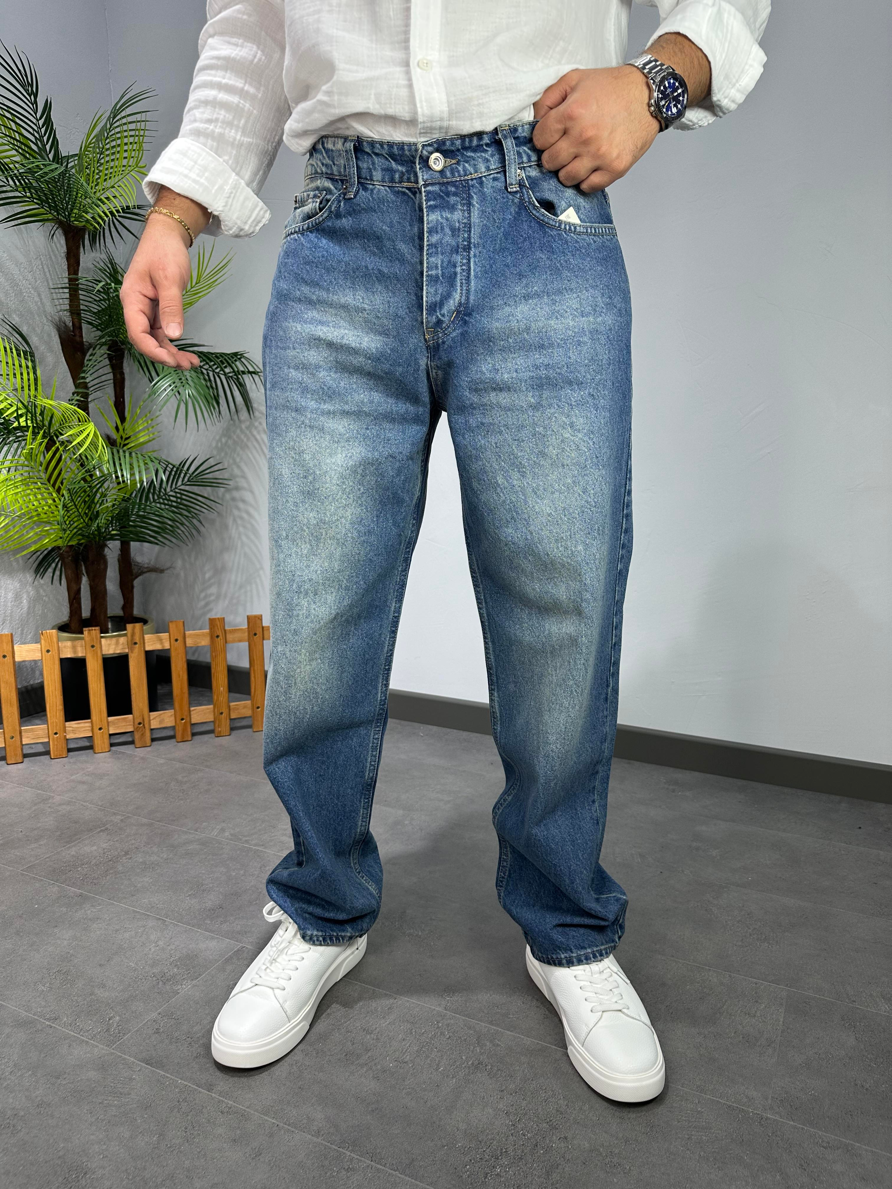 KOYU MAVİ TAŞLANMIŞ BAGGY KALIP KOT